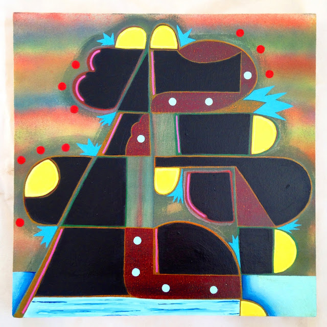 This painting came out very electric. I took this 6′ x 4′ canvas and col’ rocked a countdown. I call is “Ground Control To Major Tom”. At the top there are 10 “lumps” and it counts down, 10, 9, 8, 7, etc. until it reaches the bottom and becomes that yellow figure at the bottom, 1. It is done in oil and acrylic on canvas.